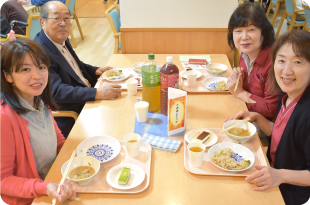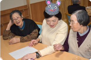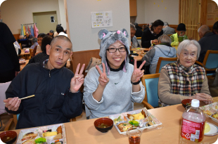 忘年会では年末のお楽しみとして、おいしい食事を味わいながらゲームをしたり、季節の歌を歌って楽しんでいます。毎回、入所者様と職員が一体となり、盛り上がる会となっています。